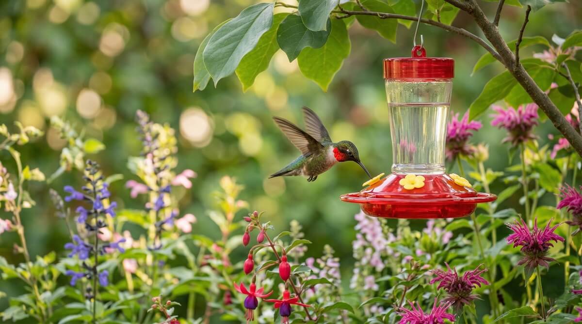 If you’re using multiple feeders: place them out of each other’s line of sight. A dominant male can guard one feeder aggressively. If he can’t see the others, more birds get access and more hummingbirds establish your yard as a regular feeding zone.