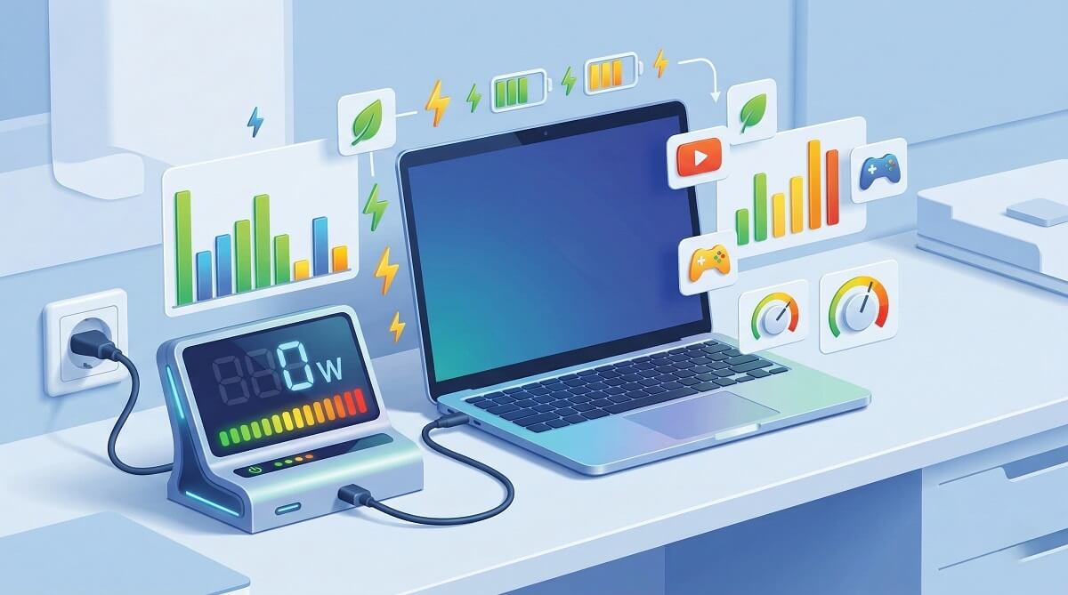 Below, we’ll break down actual wattage numbers for 2025-2026 laptop models, show you how to calculate your real electricity costs with current rates, and explain what drives power consumption up or down. Whether you’re planning a solar backup system, choosing the right charger, or just curious about your electric bill, you’ll find specific numbers instead of vague ranges.